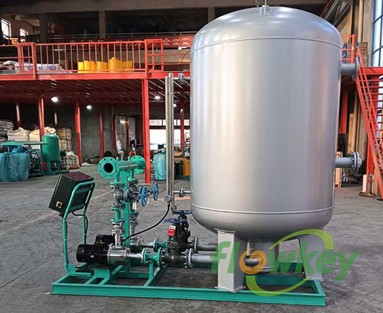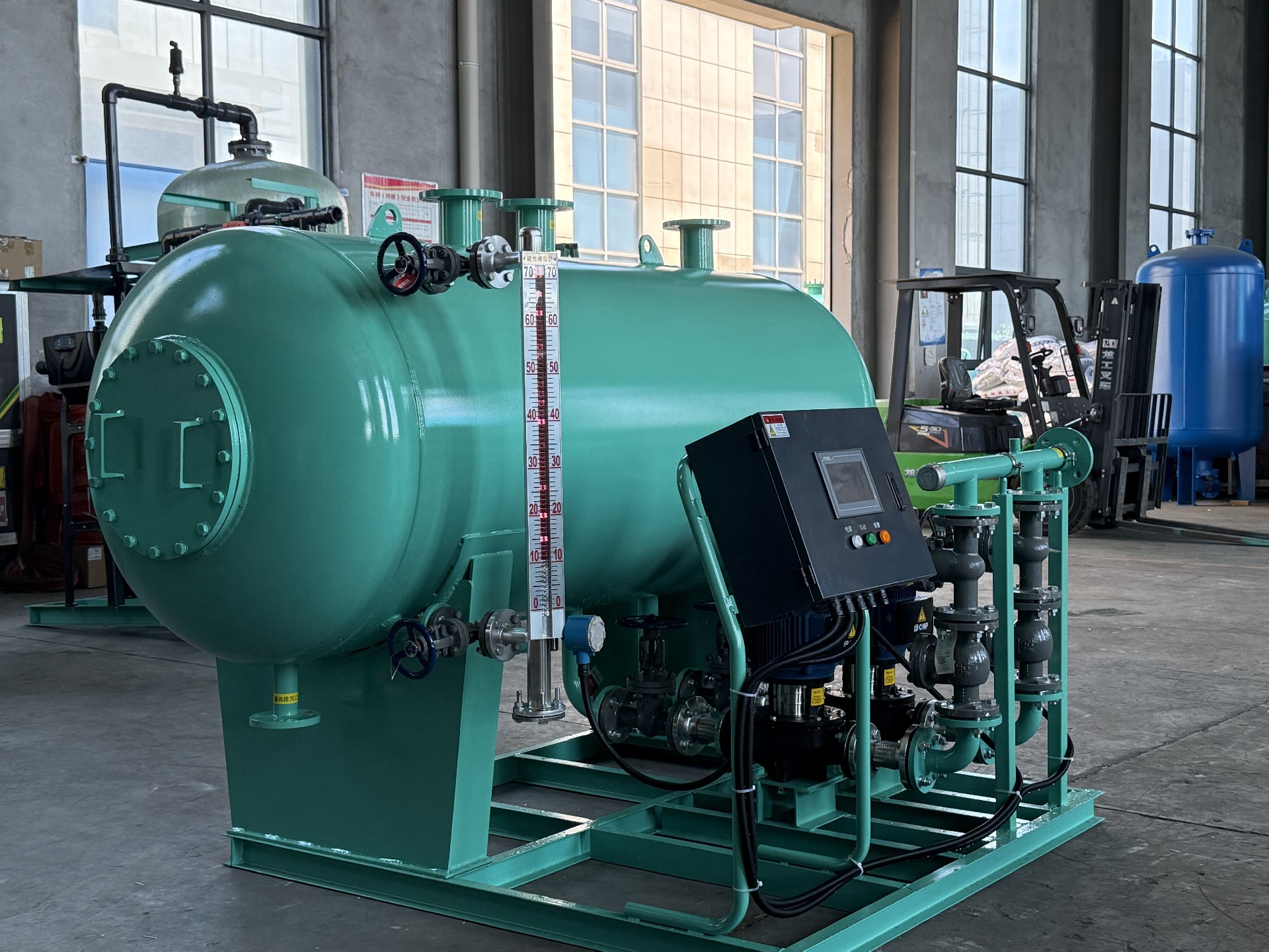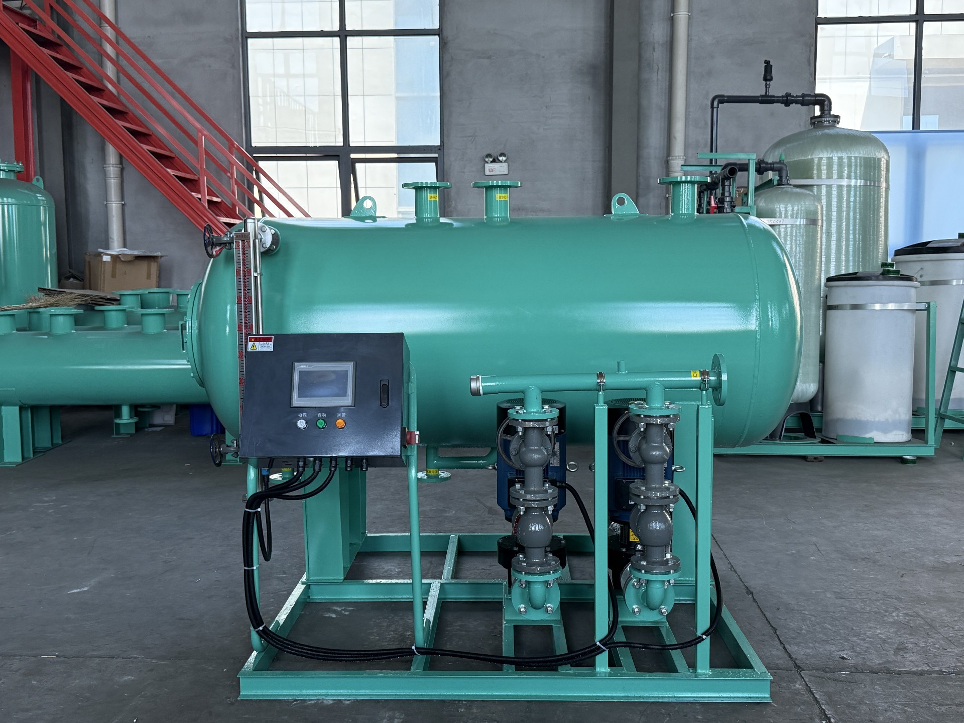 冷凝水回收装置是一种用于收集、处理和再利用工业生产中产生的冷凝水的设备,通常是由冷凝水回收罐、冷凝水回收水泵、液位传感器、阀门以及智能电控柜等组成。能够将高温凝结水作为锅炉补给水循环使用或二次闪蒸气利用,既能节约工业用水,又可以节约大量的燃料。