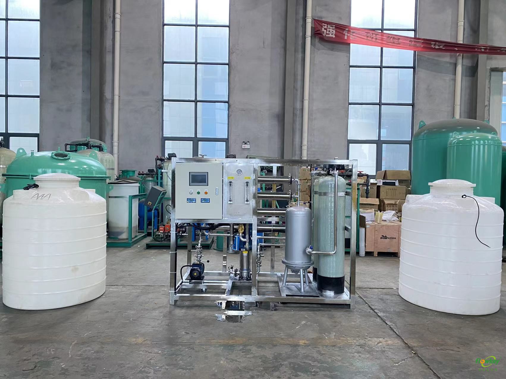 预处理部分:一般包括原水泵、石英砂过滤器、活性炭过滤器、精密过滤器等。其主要作用去除原水中的杂质,达到反渗透的进水要求。预处理系统的设备配置应该根据原水的具体情况而定。